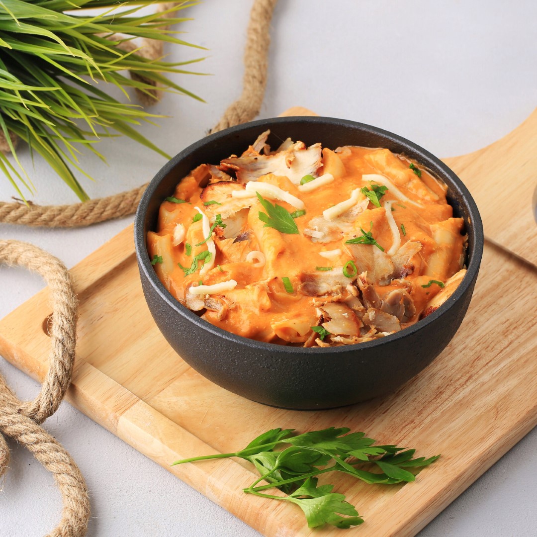 مكرونة بصلصة الكريمة البيضاء والطماطم نابوليتان الايطالية مع شاورما الحاشي والجبنة تقدم مع الفرايز والبيبسي